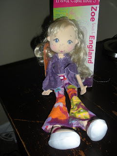 I instantly loved the concept and retracted my no-buying policy for the day.  We are going to England next month, so the Zoe doll seemed to be calling my daughter’s name.  She is the doll who just took a trip to Canada in 2008.  My daughter took an immediate liking to her.  She’s dressed like a little hipster.